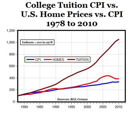 Has the cost of college so dramatically increased in countries where higher education is directly publicly funded? I’m inclined to guess that it hasn’t and, if true, the real problem would be the mixture of government support and for-profit interests. If the US government had set up a complete system, a large part of the problem would not exist. In fact, when I just looked up tuition for colleges in Britain, I came up with 3,375 pounds, or about $5,440 US. Not bad! And when I looked up tuition in France, I found that a student pays about $540 and the government contributes about $16k. That’s about what we pay in NY per student for public K-12.