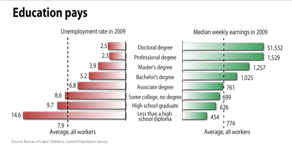 The next thing that is important to note is that the chart doesn’t account for differences in the circumstances and abilities of the people in each category. It’s safe to assume that on average, high school dropouts are less intelligent, less motivated, come from a background with fewer opportunities, are more likely to get involved with drugs, etc. than the people who strive to become doctors or lawyers. We would expect the high school dropout population to have less job success than the doctorate population regardless of formal education. A more accurate gage of the impact of education would be to examine the employment statistics for people of similar backgrounds, personalities and abilities, who chose different levels of education. Unfortunately, this data is harder to accurately track.