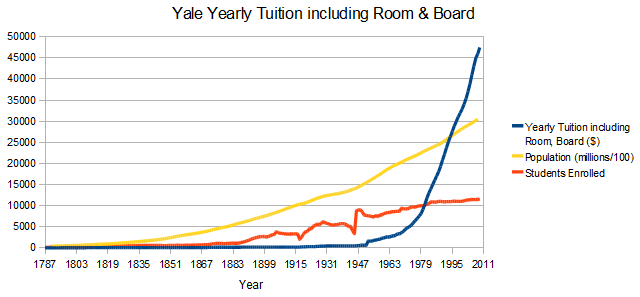 The chart on the right shows that since 1978, college tuitions have increased at three times the rate of inflation. How could that be? The advent of computers and the internet should be bringing the cost of education down as record keeping and administration has become much easier. Sure, colleges are spending money on new buildings such as fancy gyms, but they’ve always done that. Most colleges already have a good portion of their buildings already in place and fully owned. Not to mention, enrollment is rising to pay for new infrastructure. Competition from online colleges should be forcing brick and mortar Universities to keep prices low. Could it be that something else is going on? The chart below is very informative. It tracks the price of tuition, room and board at Yale University since 1787.