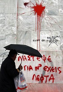 The rules of the bailout say that the money must first be used to pay back creditors (aka the banks) while the Greek people get austerity and liquidation of public assets. In fact 87% of the bailout money goes right back to the banks holding prior debt, while 13% goes to the Greek economy. The icing on the cake in my eyes, was a fine print clause that, according to the New York Times, would allow creditors to seize Greece’s 100 tons in gold reserves if needed.